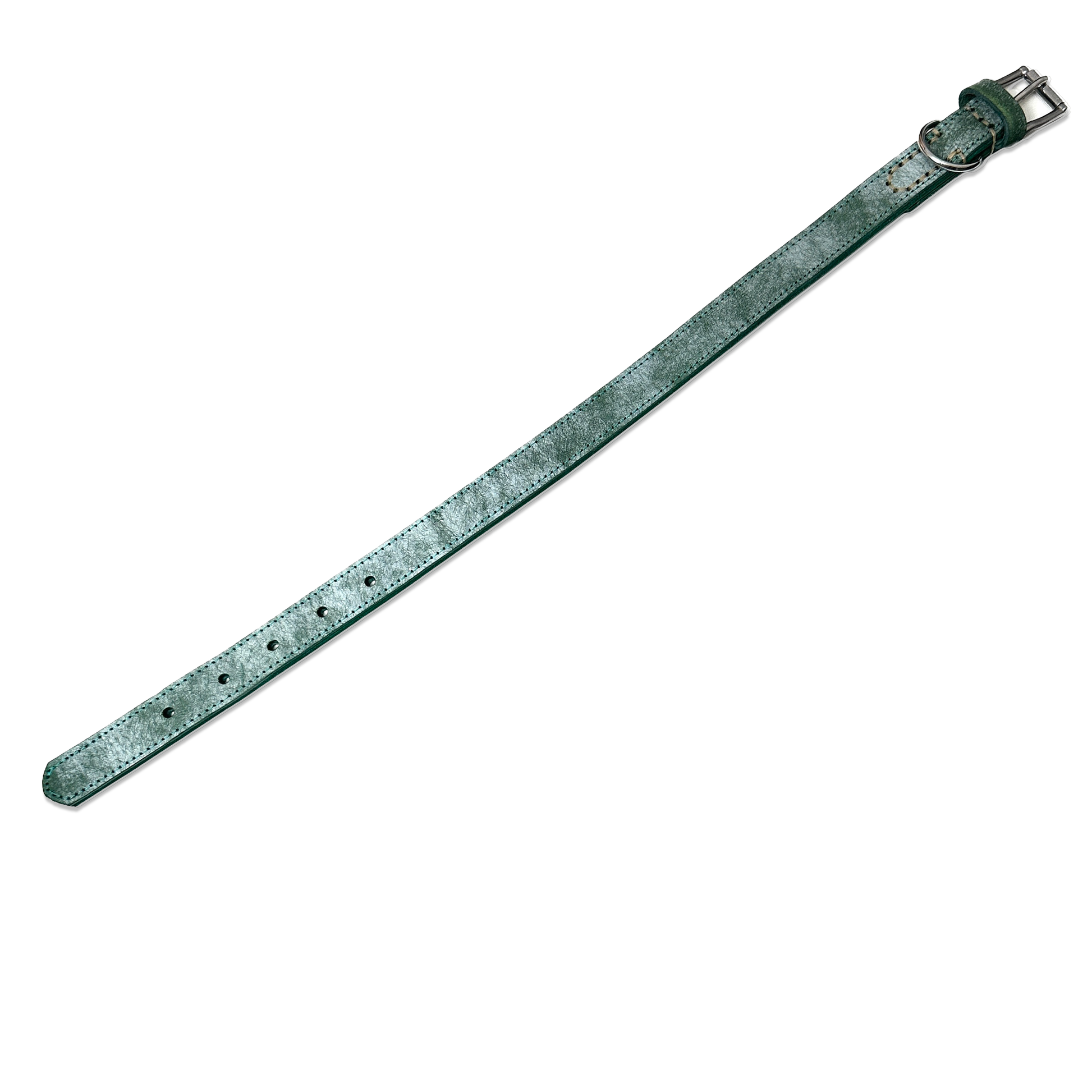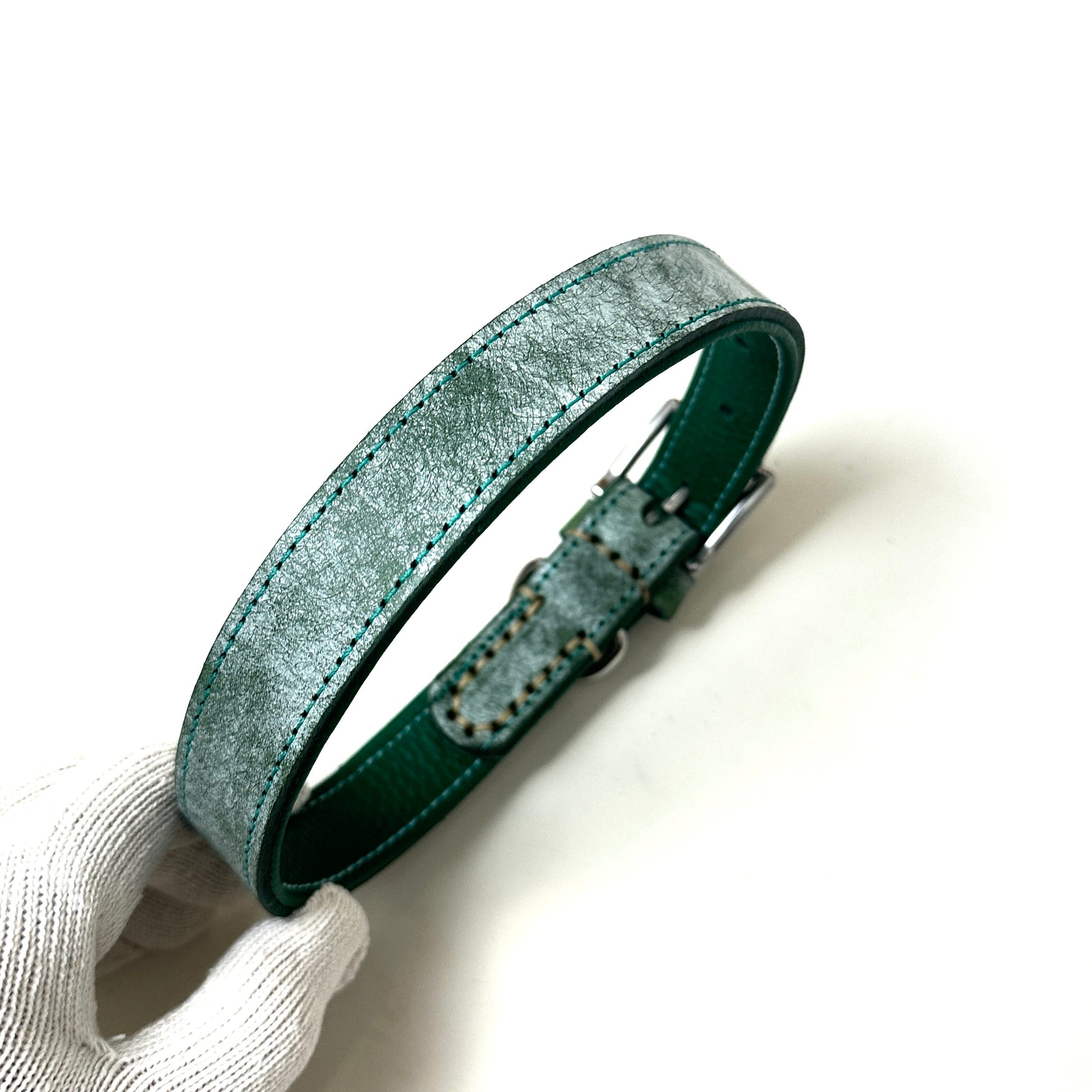 Crafted from full-grain cowhide and finished with solid metal hardware, this collar balances structure, comfort, and restraint. The Arctic Green tone brings a muted, uncommon character — subtle in daylight, deep in texture, and made to age naturally over time.
